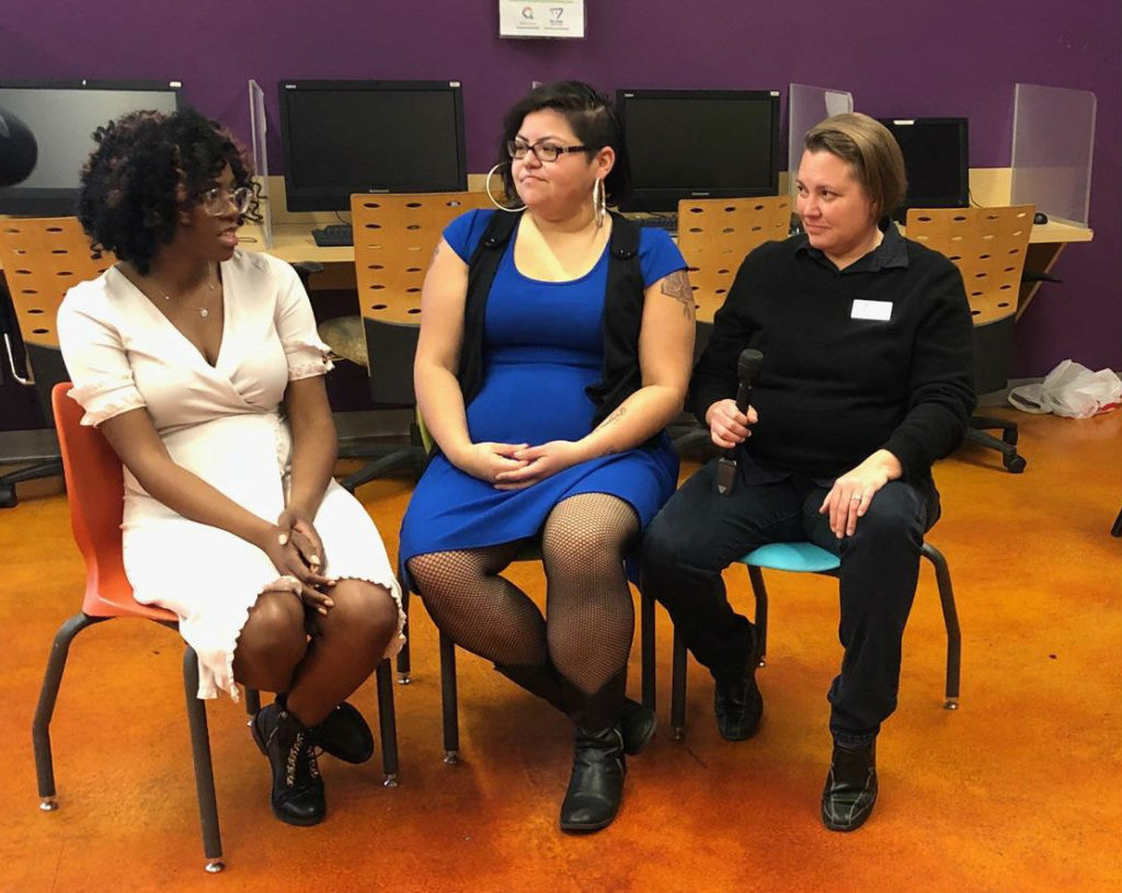From left: Natasha Williams, national Women’s March team member; Yesenia Moya-Garay, who produces social media for the Women’s March; and AJ Hunt, a youth coordinator at The Center in Las Vegas, appear at The Center in Las Vegas, Nevada, on Jan. 20, 2018. They are preparing for a rally in Las Vegas on Jan. 21. Photo by Kamaria Roberts